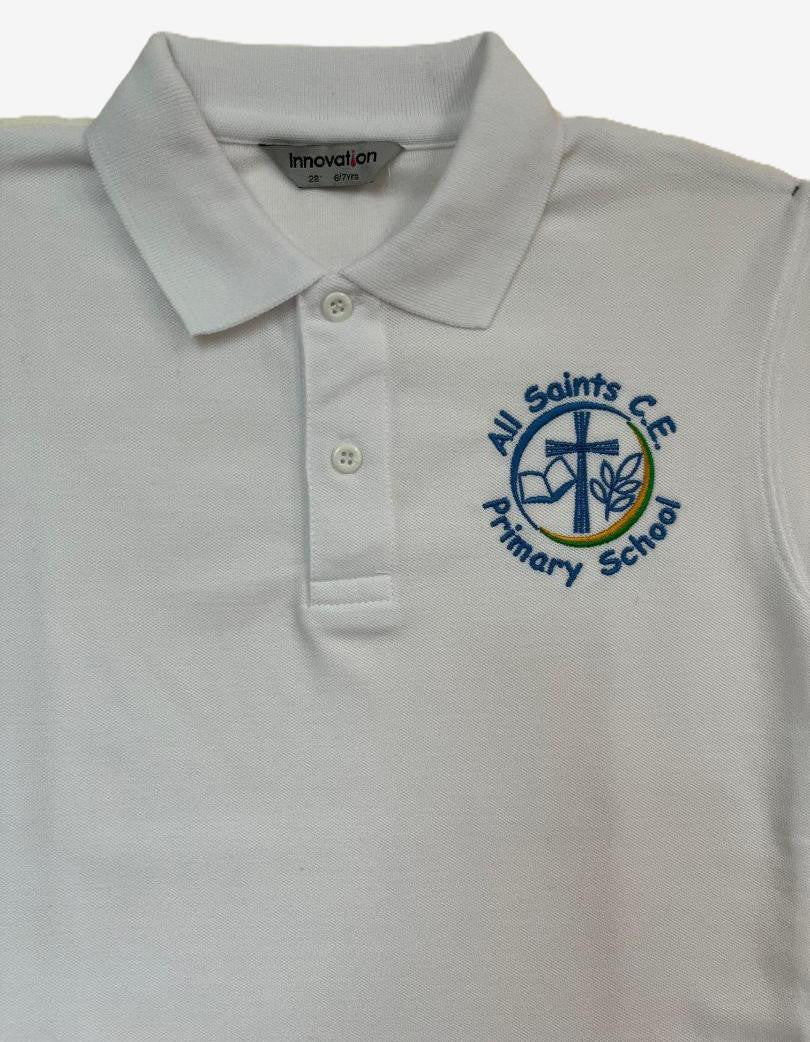 ALL SAINTS POLO SHIRT is white with contrasting, mainly blue, All Saints Logo. 65% polyester, 35% cotton. Machine washable. Sizing by age & approximate chest measurement in inches as follows: