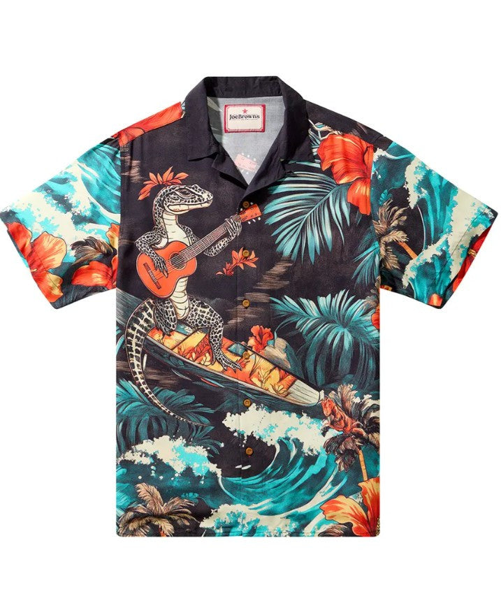 JOE BROWN'S LIZARD SURF SHIRT is a fun party or beach shirt, featuring a unique surfing black & white lizard with an orange guitar print in a tropical setting of blue palm trees, orange hibiscus flowers and turquoise ocean waves on a black background. The shirt style is slightly oversized and in a longer length to wear out (not tucked into trousers), with an open flat notched collar, buttons down the front and short sleeves. Made in India from 100% viscose, the fabric is soft and drapey. Machine wash at 30 degrees.