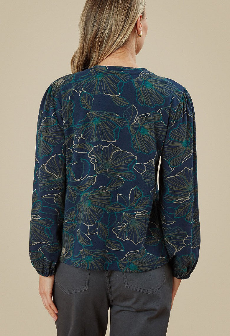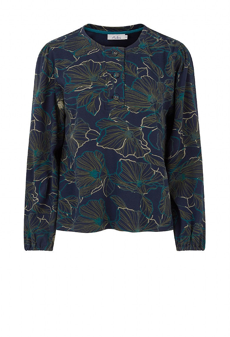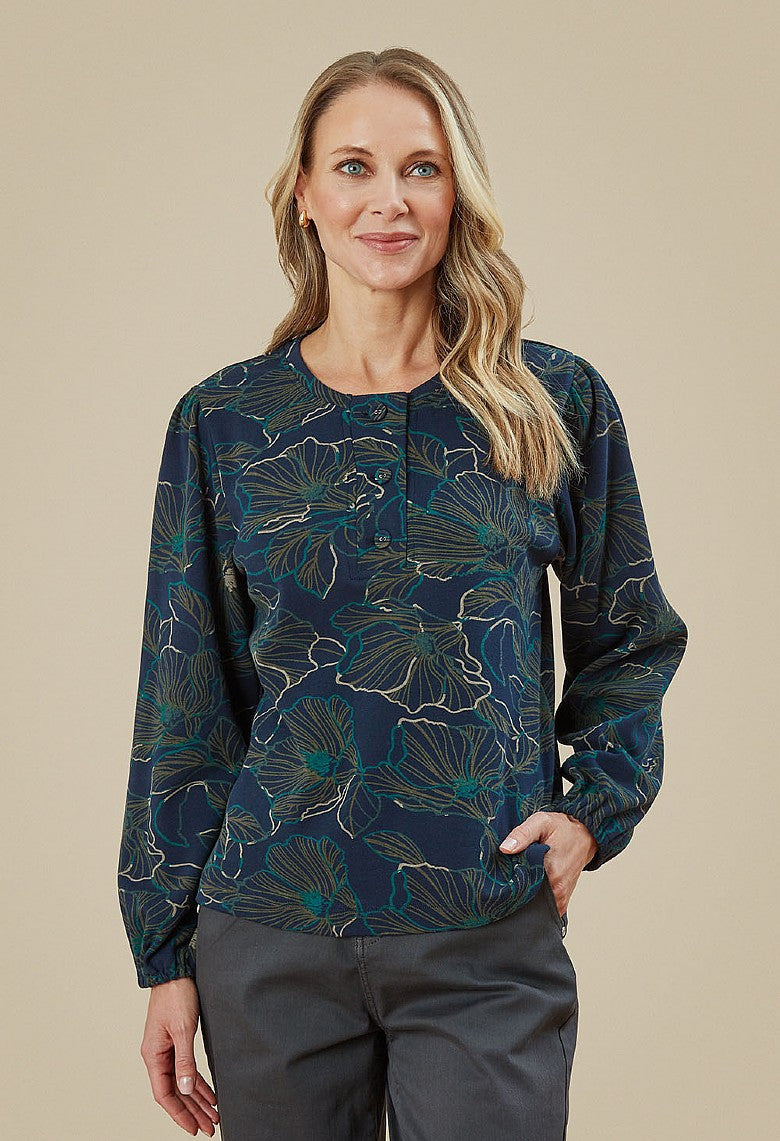 ADINI'S NICOBAR TOP WITH FINE FLORAL PRINT has a round neck, 1/4 front opening with 3 fabric covered buttons & long sleeves with elasticated cuffs. The fabric features an abstract anenome flower outline in olive, tan & teal on a navy background. Made in India of winter weight 100% interlock cotton jersey. Machine washable at 30 degrees.