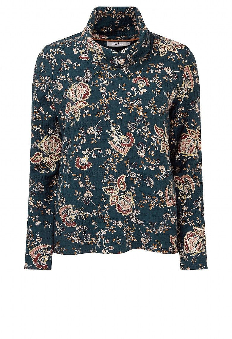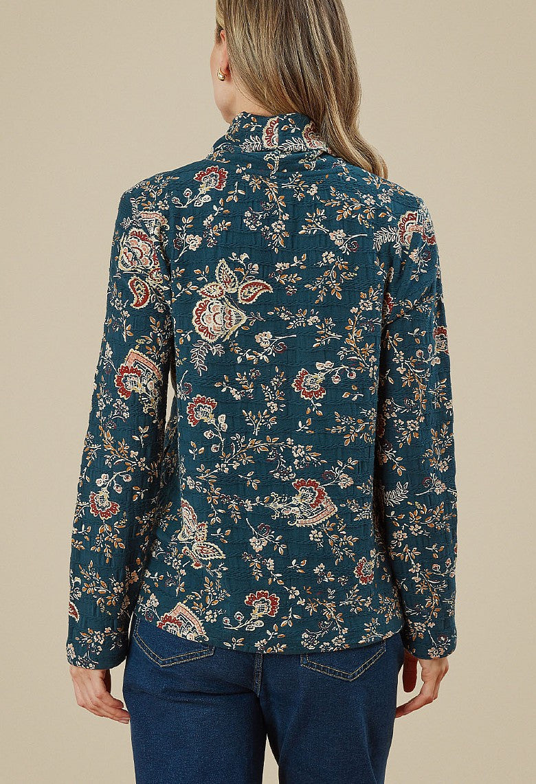ADINI'S VELMA TOP JACQ PRINT in deepest teal is a soft roll neck tunic with an A line shape, long sleeves & 2 side seam pockets. Made from 100% textured cotton jacquard jersey fabric, there is an antique looking pattern of paisley & flowers in burgundy, beige & olive on a teal background, as well as a raised horizontal rope pattern woven into the teal background. Made in India. Machine washable at 30 degrees.