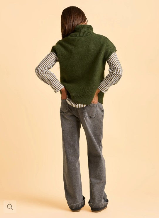 BRAKEBURN'S MARINER TANK TOP in Forest Green features a chunky knit and sleeveless shape that's great for layering. It has a ribbed roll neck, ribbed armholes and hem, and a single cable down the center front. It has a boxy, oversized fit. Made in China from 61% polyester, 32% acrylic, 7% wool. Cool water wash.