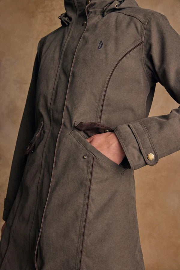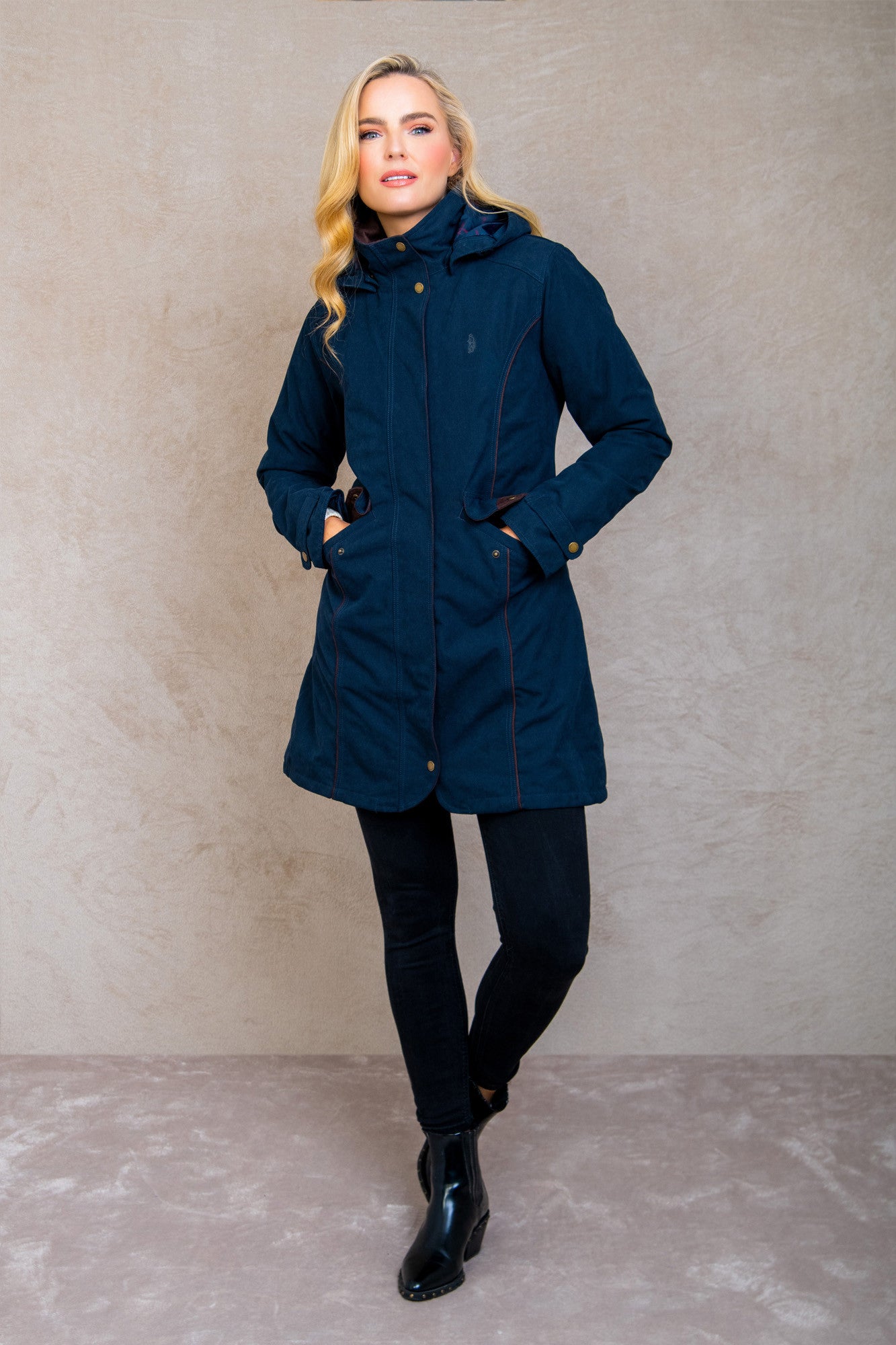 Jack Murphy Una Riding Jacket, in Heritage Navy and Olive Green. Designed in Ireland by Jack Murphy, this waterproof and breathable coat has a princess line, flared, shaped cut, suede effect collar and curved front seams. Zip and snap front closure. Single vent in back, closed with snaps. Detachable hood. It has a quilted navy lining for warmth. The coat is designed to fall just above the knee (length from back of neck is 87cm). Trim on two front pockets. Two inside pockets. Outer shell is 80% polyester, 20% nylon and lining is 100% polyester. Machine washable at 30C.