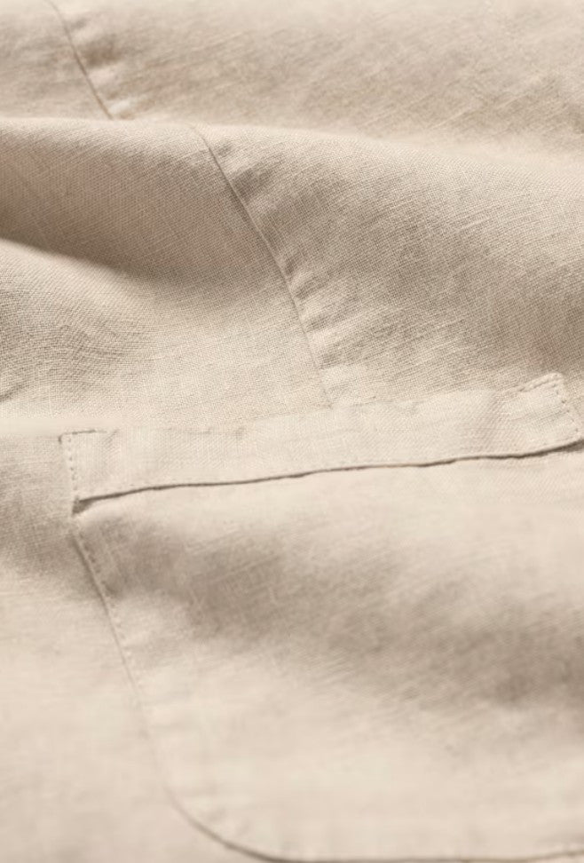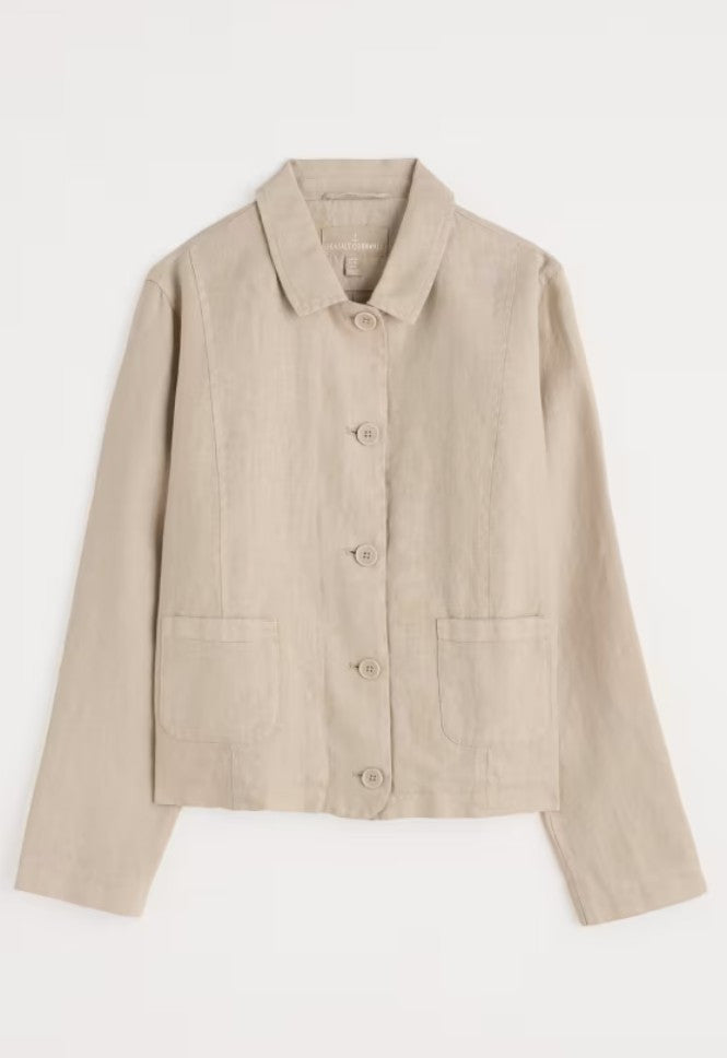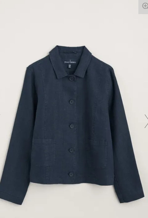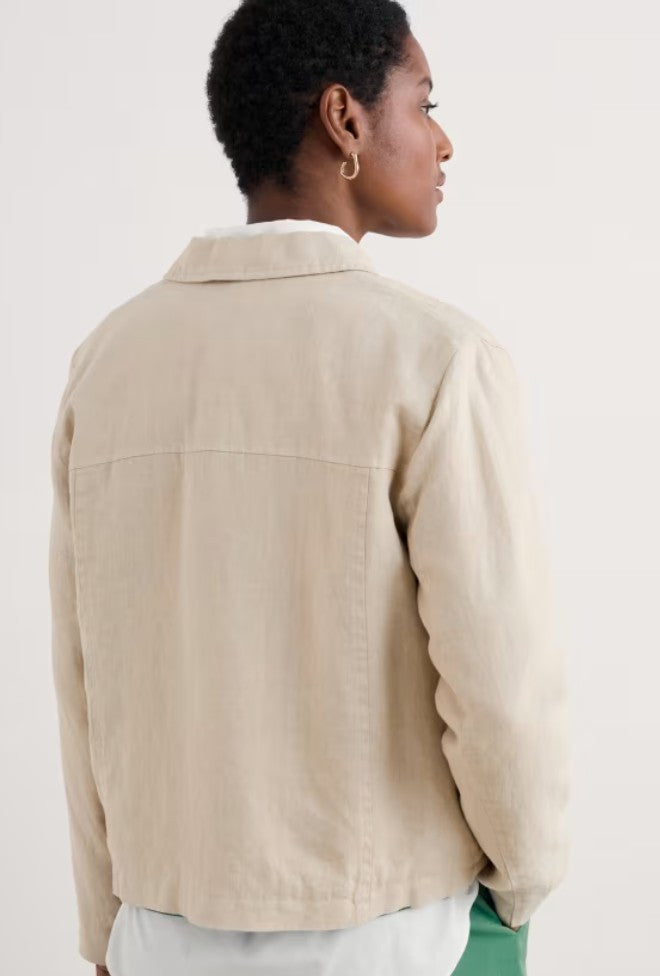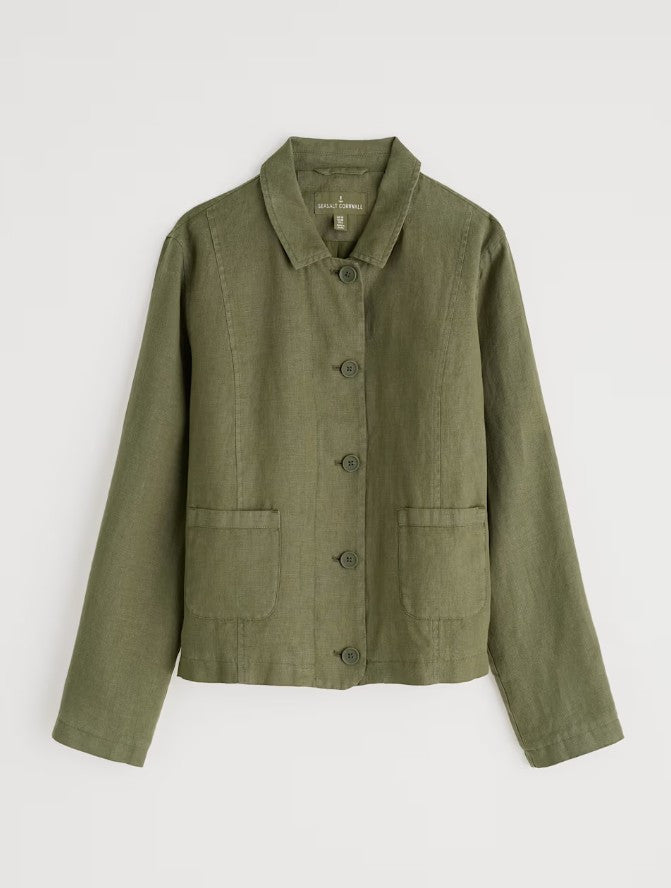 Seasalt's Arame Linen Jacket is available in olive green, beige & navy (maritime) colours. It is a classic garment dyed jacket with an easy relaxed boxy structure that falls to the hip in length. There is a pointed collar, curved princess seams, button opening down the front & patch pockets. Fully lined. Made in China from 100% linen (outer) & 100% organic cotton (lining). Machine wash at 30 degrees.