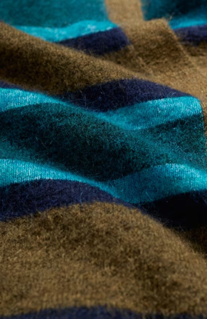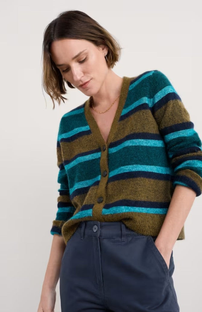 SEASALT's ETCHING CARDIGAN with mohair is both warm & soft with a fine 7 gauge knit, featuring bold stripes in autumnal hues of olive, teal, turquoise & navy. It has a V neck, button opening down the front placket, ribbed cuffs & hem. A great transitional piece, it can be worn as a cardigan or jacket. Made in China from 37% recycled nylon, 30% mohair, 30% wool & 3% elastane. Cool hand wash.