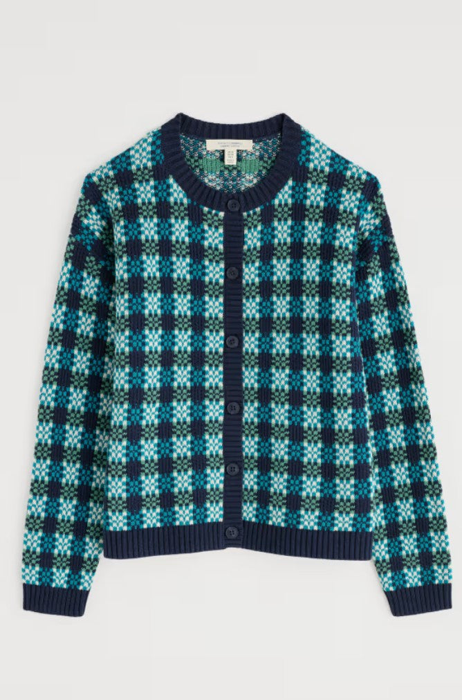 SEASALT's KENSA CARDIGAN features a retro knit with jacquard squares in blue, teal, white & green & navy trim. A great transitional piece, it is made in China from 100% organic cotton with a chunky knit. It has a ribbed crew neck, front placket & hem in navy. It has a boxy shape with dropped shoulders for a more casual look. Machine washable.