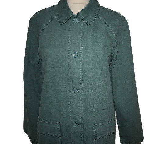 SEASALT'S ROBERTS COAT is a versatile car coat length great for transitional spring to summer or summer to autumn weather. The outer fabric of the coat, in a sage green colour, is made from a denim weight twill fabric, has a Peter Pan curved collar, large buttons down the front, 2 front patch pockets with flaps, and raglan sleeves. It is fully lined. Made in China, the outer fabric is 100% organic cotton, the lining is 100% cotton. Cool machine wash at 30 degrees.