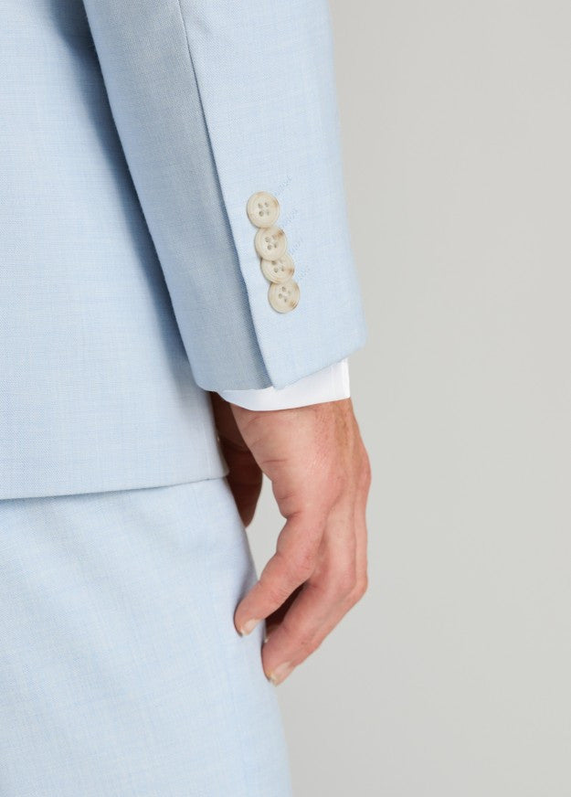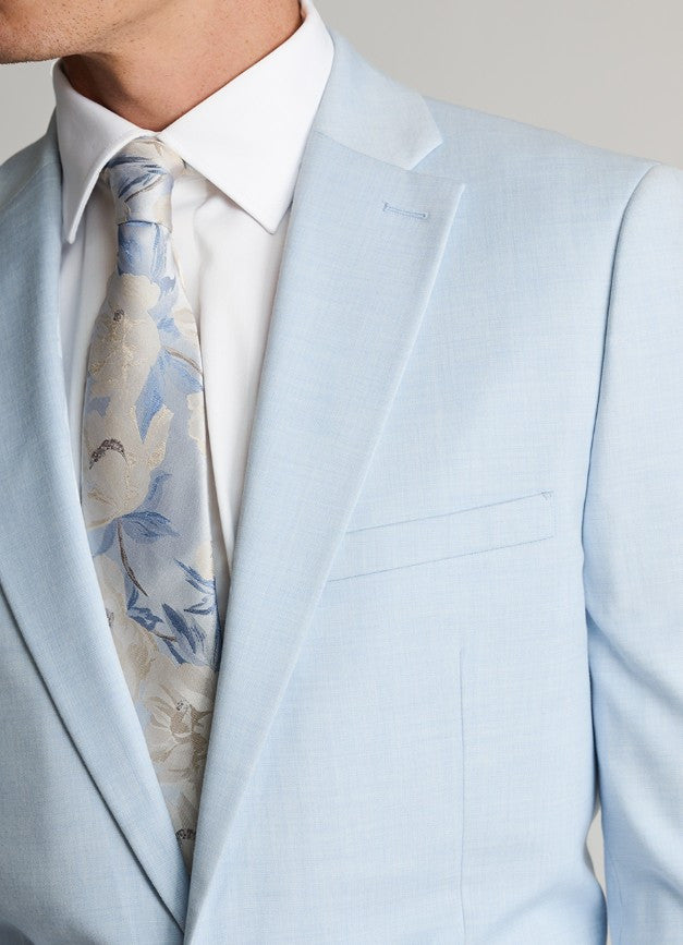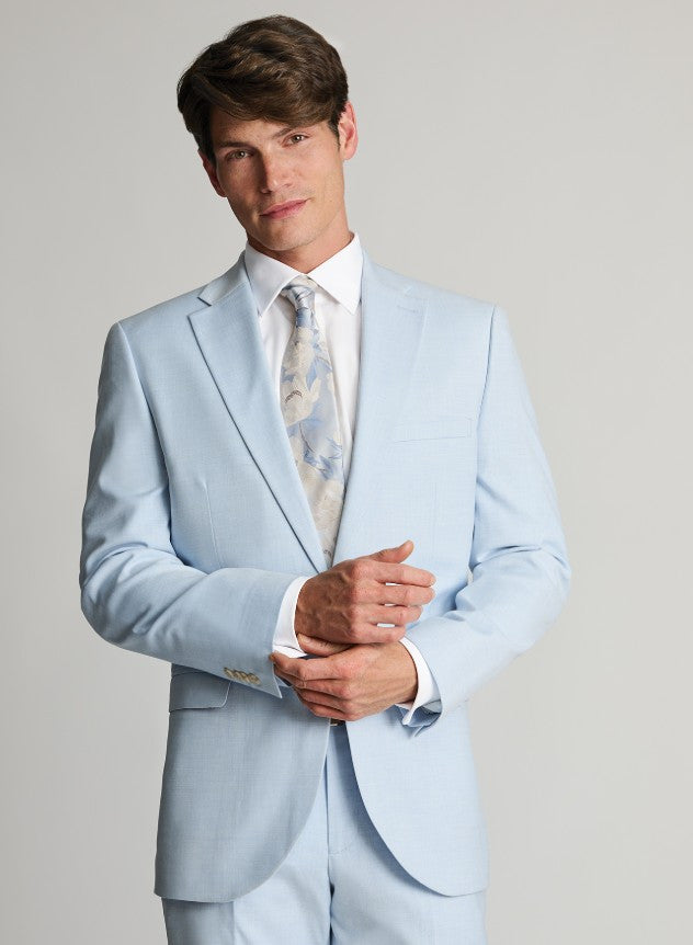 BROOK TAVERNER'S HAYTON SUIT JACKET, available in sky (light) blue is the perfect look for a summer party or wedding. The jacket has a tailored fit, with a classic notched collar, 2 button, single breasted opening, 2 rear vents, 2 lower front pockets with flaps and 1 breast pocket. Made in a refined, textured fabric from 68% recycled polyster, 29% viscose & 3% elastane. Fully lined. Matching trousers and/or a waistcoat may be added to create a wonderful suit! Wards carries regular lengths in sizes 40-50 chest measure, and short lengths for sizes 42-46. Dry clean only.