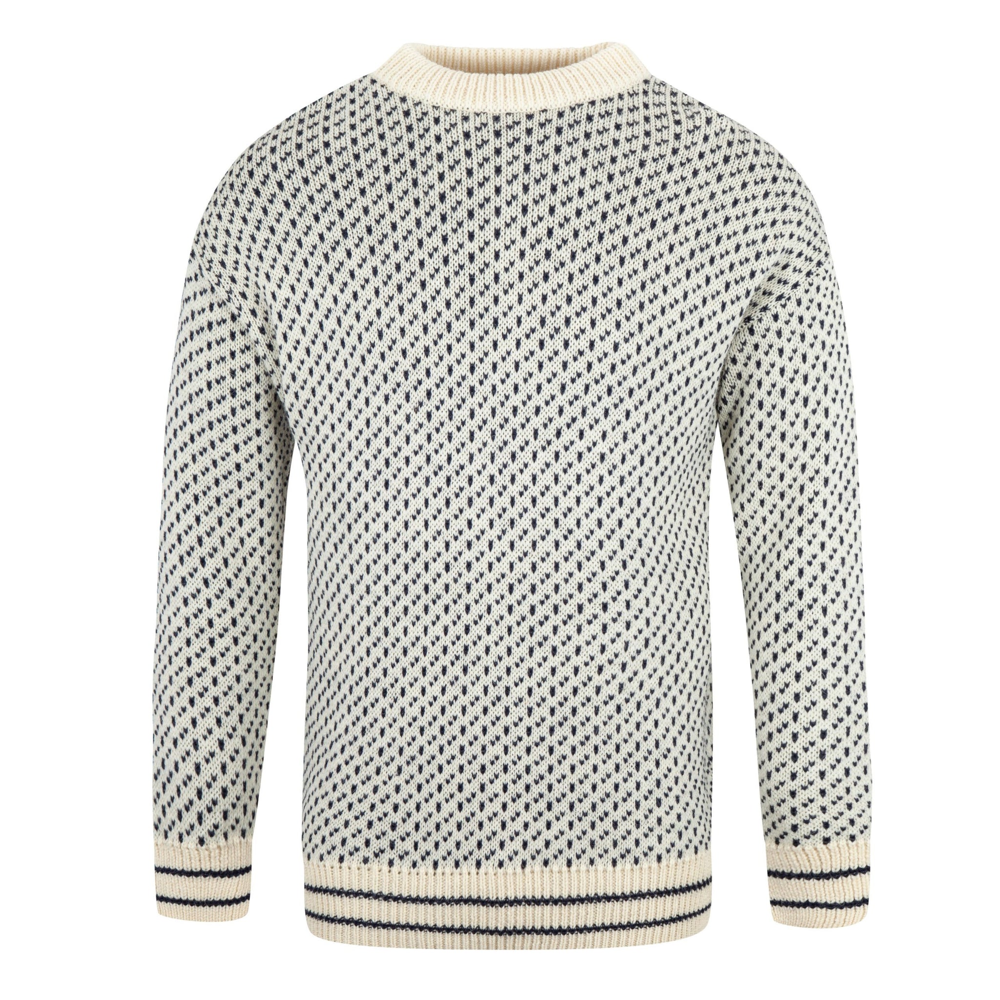 JM Cooper's Nordic Knit Sweater, available in unisex sizing, features a warm, chunky knit with a traditional Nordic fisherman pattern. It has a thick, ribbed crew neck line & cuffs. Available in navy with white flecks & stripes or ecru with navy flecks and stripes. Made from 100% British wool. Hand wash in cool water and lie flat to air dry.