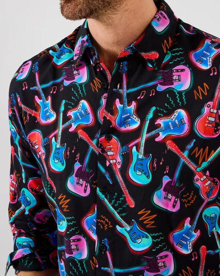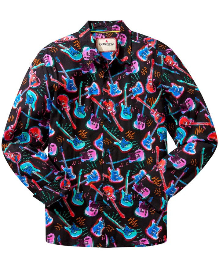 JOE BROWN'S FUNKY GUITAR SHIRT is a classic notch collar shirt with long sleeves and cuffs, but made from a fun print, featuring neon electric guitars in turquoise and pink with orange and turquoise "sound waves" on a black background. There is also contrasting yellow tape trim. Made in India from 100% viscose, the fabric has a soft, drapey feel. It is also slightly oversized to wear out (not tucked into a shirt). Machine wash at 30 degrees.