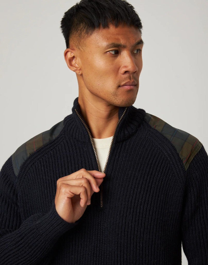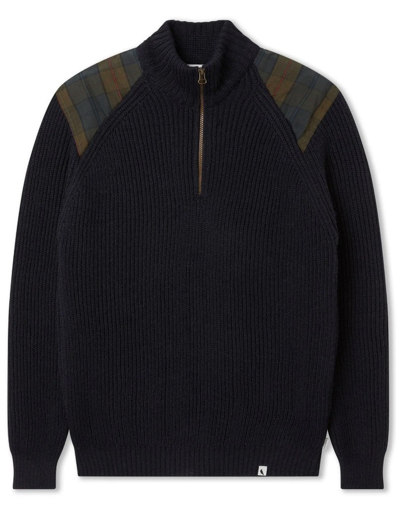 PEREGRINE'S BEXLEY QUARTER ZIP JUMPER in navy features a vertical, thick, ribbed knit with a 1/4 zipper opening down the front, high neck and raglan sleeves with grey & blue tartan wool shoulder pads. This jumper offers great warmth, style & comfort! Made in England of 100% wool. Handwash in cool water & lie flat to air dry.