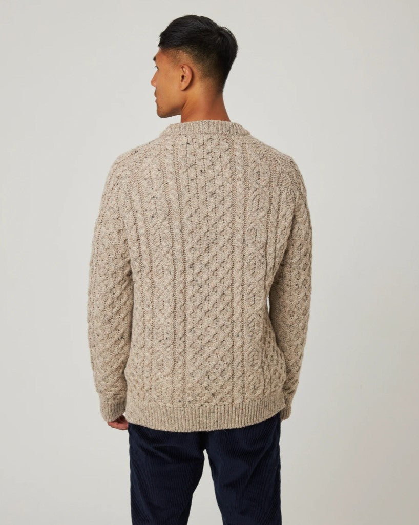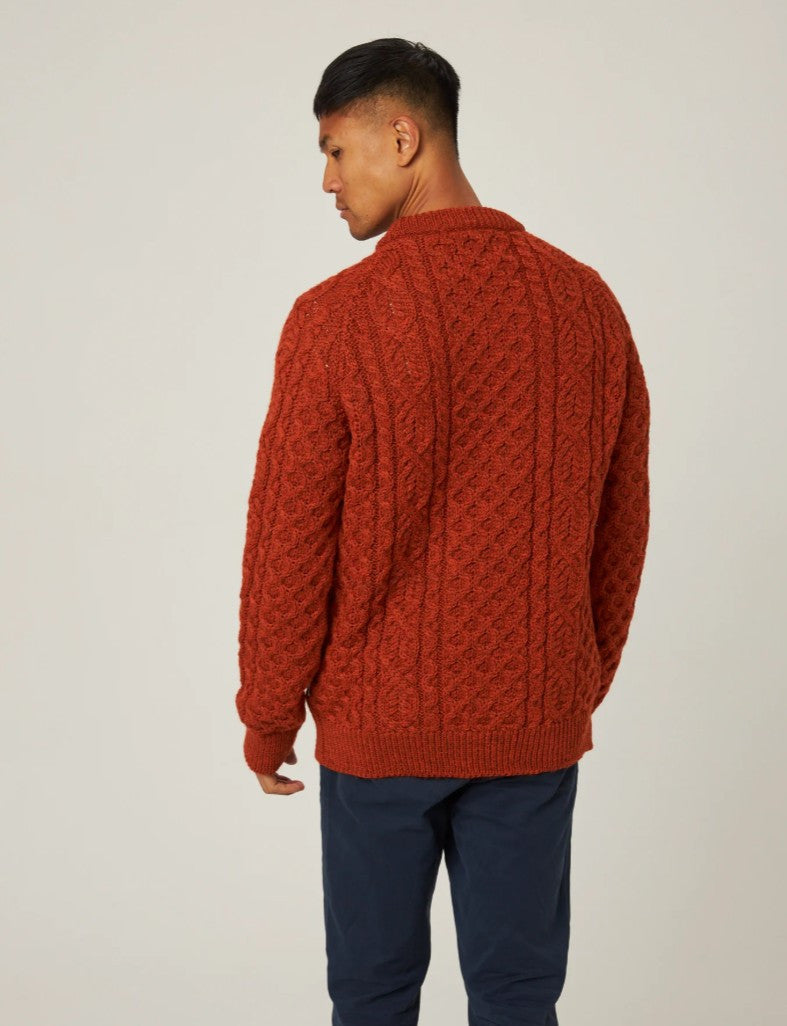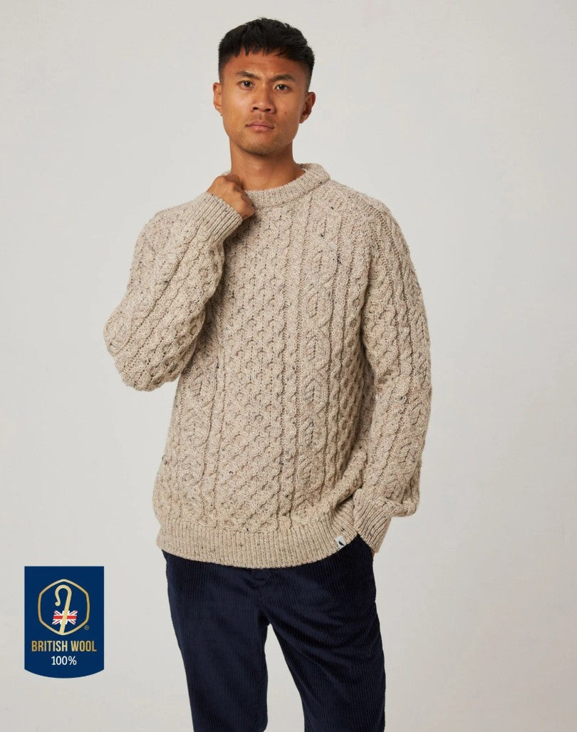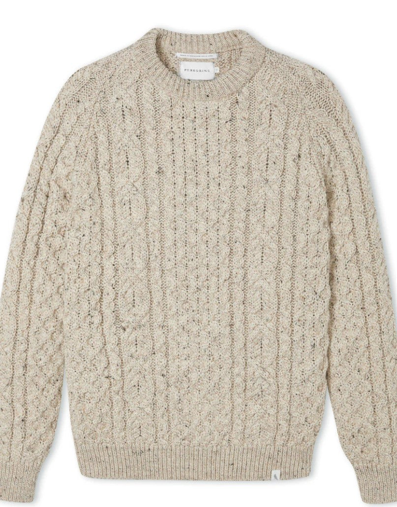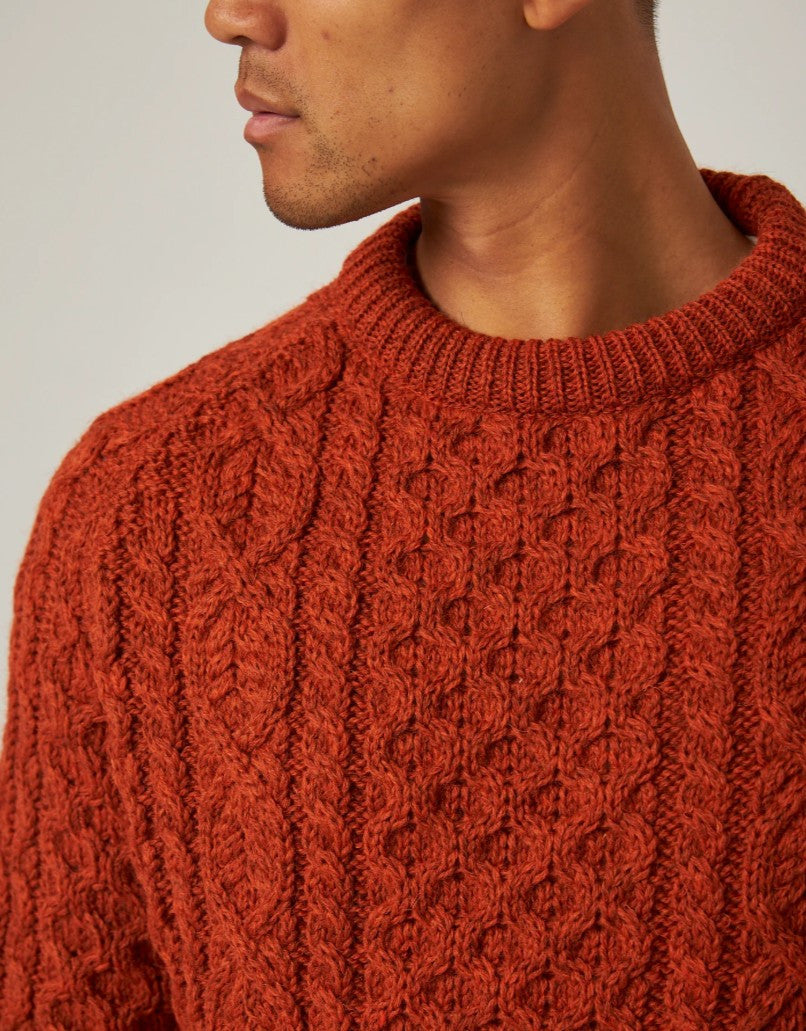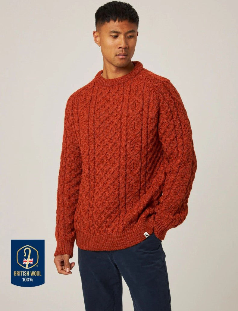 PEREGRINE'S HUDSON ARAN JUMPER is available in oatmeal (skiddaw) & burnt orange, both with flecks of other colours spun in to add depth of shade. This jumper features a classic cable knit design inspired by traditional British fishermen. Designed for warmth, style & comfort, it features a vertical aran thick gauge knit, ribbed crew neck line, raglan sleeves, ribbed cuffs & hem. Unisex as size M is suitable for ladies. Made in England of 100% wool. Hand wash in cool water and lie flat to air dry.