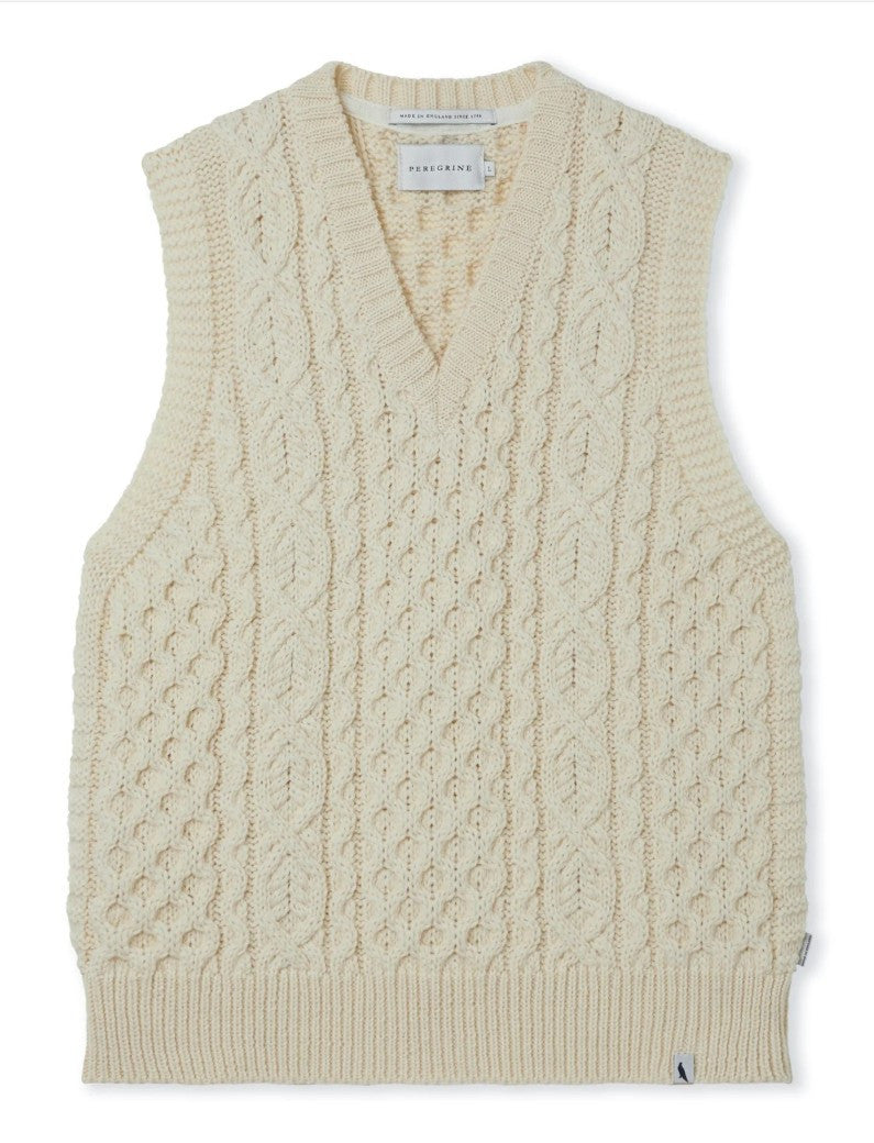 PEREGRINE'S HUDSON ARAN KNIT VEST in cream (ecru) features classic styling and a timeless cable knit pattern knit with a ribbed V neck, ribbed hem and large armholes. It's great for warmth and layering! Made in England of 100% British wool. Hand wash in cool water and lie flat to air dry.