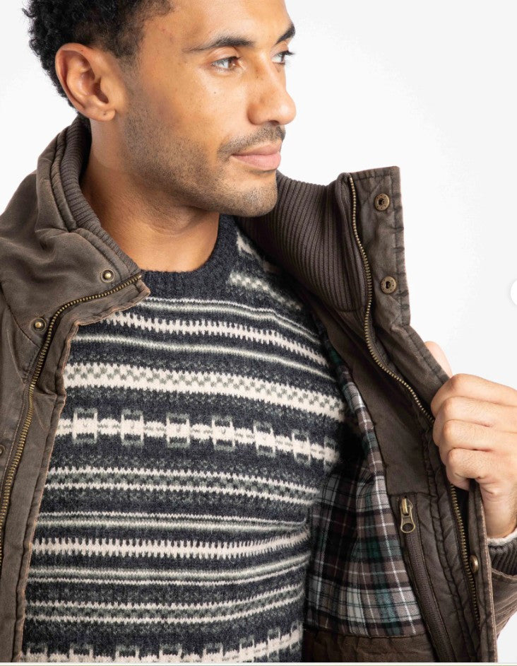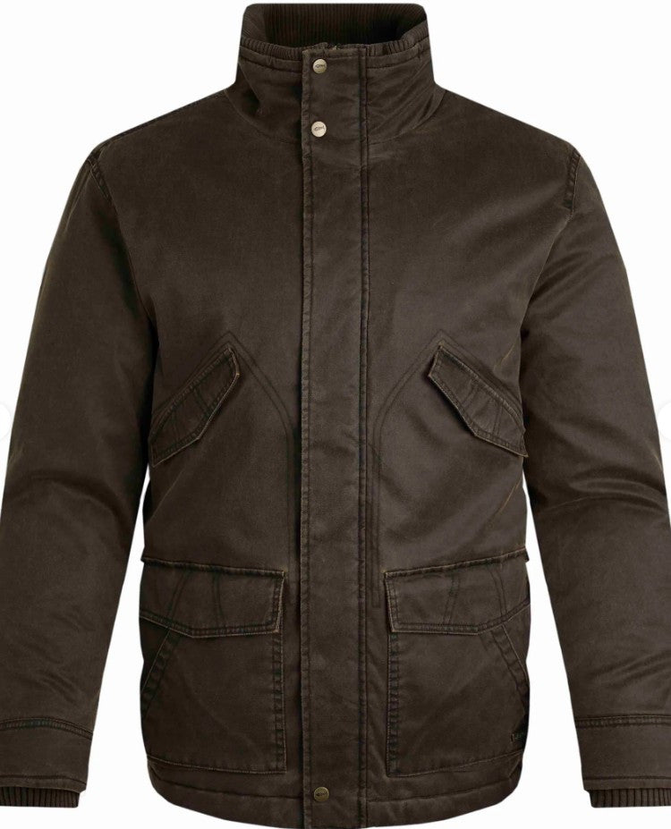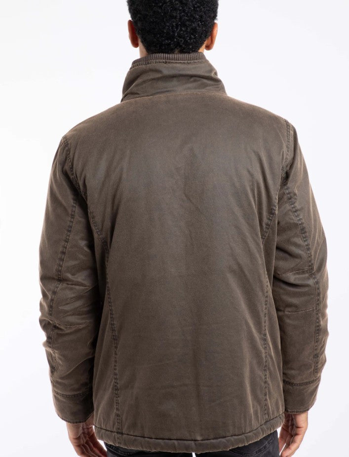 WEIRD FISH'S THUNDERCHIEF JACKET in bark (brown) is an "old Weird Fish favourite" with timeless styling for country & city wear. It features a vintage looking, washed and waxed outer fabric with cordoroy lining inside the collar, full zipper opening & front overlapping panel with snap closure. There are 2 lower pockets with flaps and poppers, 2 breast pockets with flaps and a quilted lining. The outer fabric is made from 57% polyester & 43% cotton;the lining (upper body) is a brown, white & green tartan fabric made from 100% cotton; the quilted lining (lower body and wadding) are made from 100% polyester. Machine washable at 20 degrees.