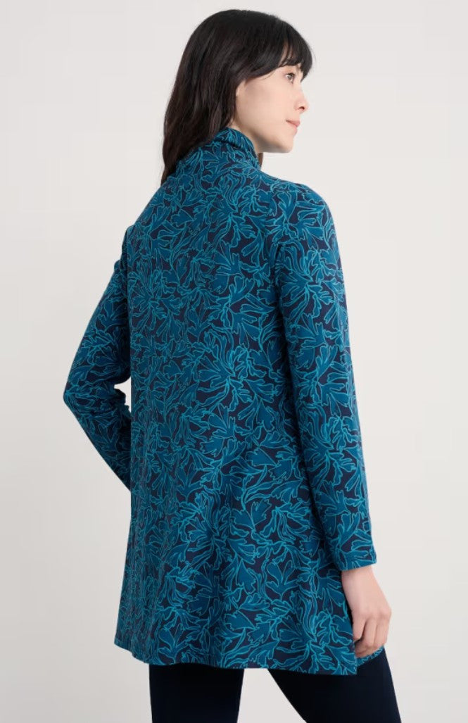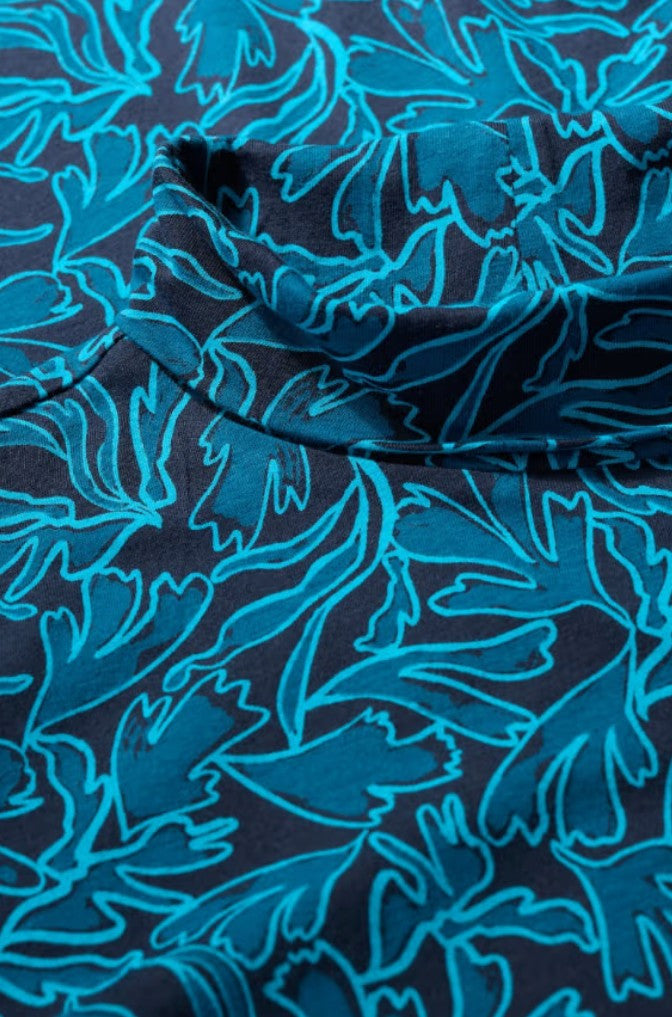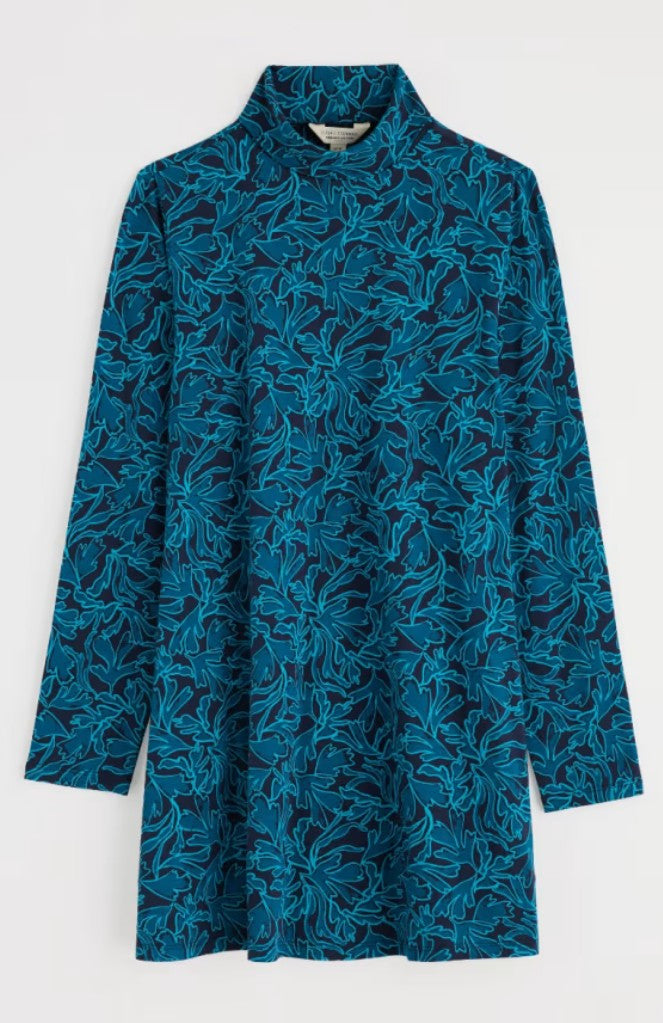 SEASALT'S GRASS KELP A LINE TUNIC- Drawn Seabed Marine- is a comfortable tunic featuring an abstract seaweed/kelp pattern in bright turquoise on a navy background. It has a relaxed roll neck line, in seam pockets & 3/4 length sleeves, falling to the knee. Made in India from 96% organic cotton jersey & 4% elastane for stretch. Machine wash at 30 degrees.