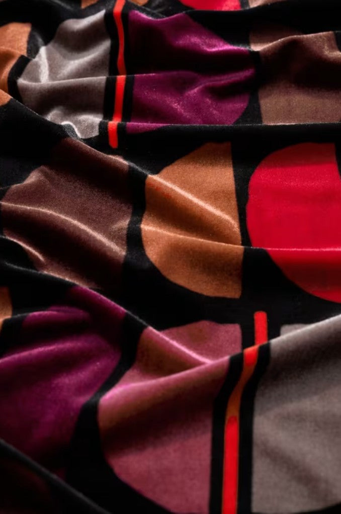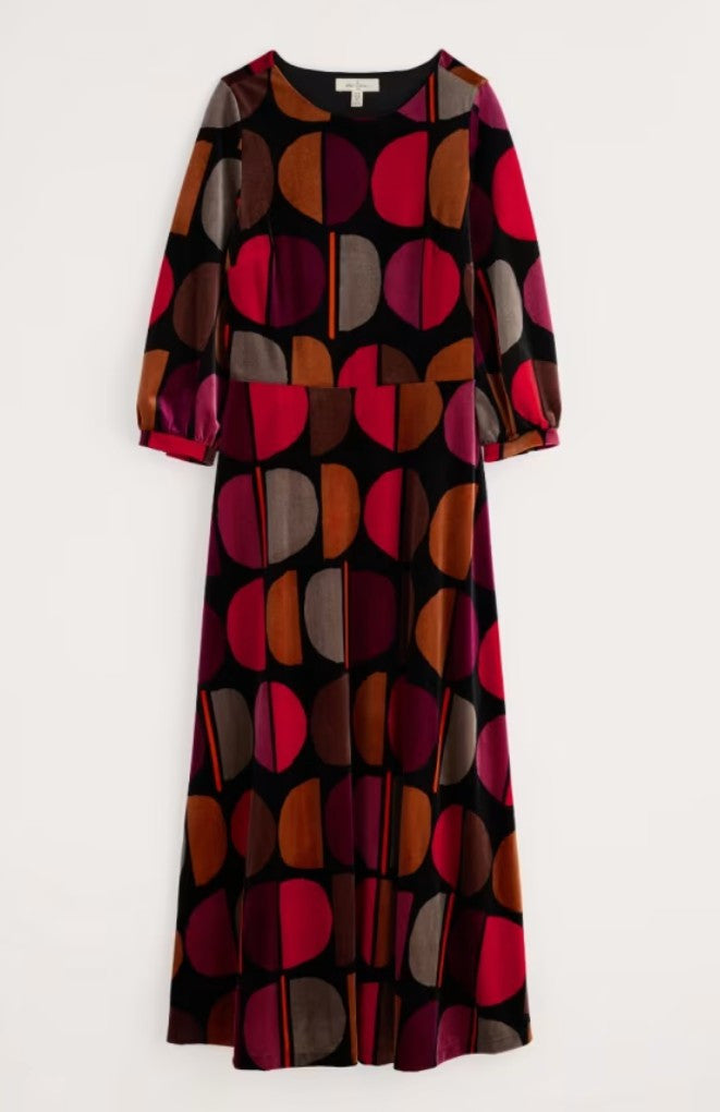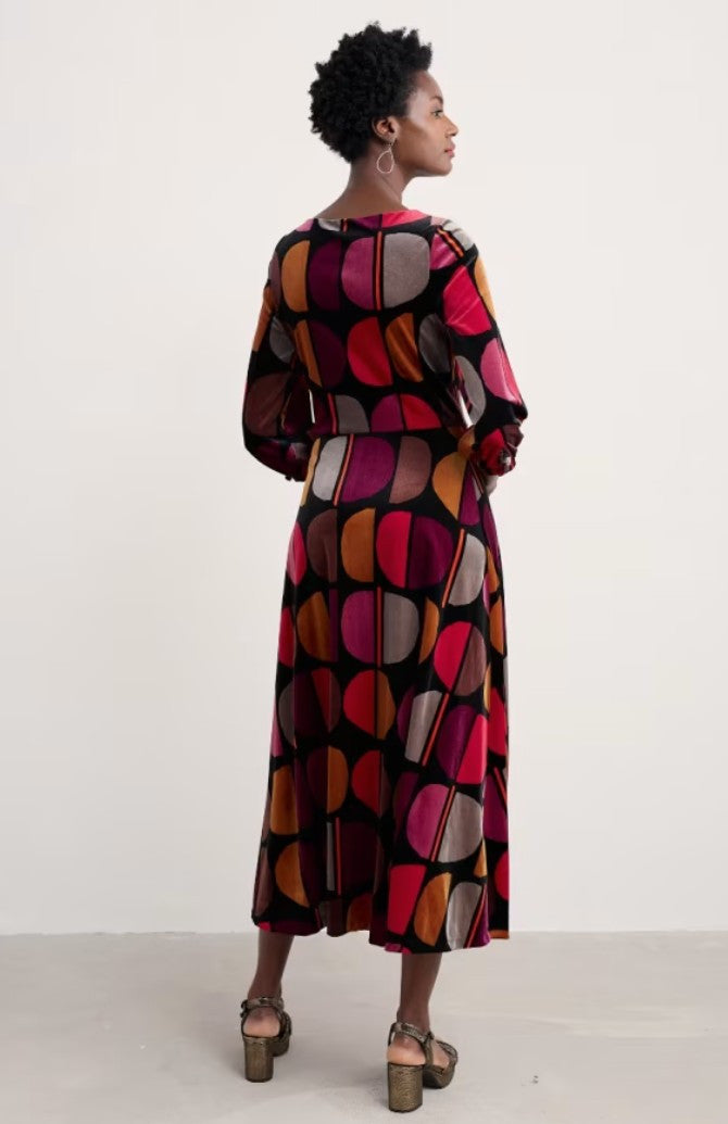 SEASALT'S OAK COTTAGE VELVET DRESS- Half Moon Stamp Onyx- features a "mod" pattern with large circles in fuschia, red, mauve, grey & peach printed on a black background of luxurious &,iridescent velvet fabric that catches the light! Perfect for parties & special occasions, this festive dress has a simple but elegant and romantic "fit & flare" shape, with a round neck, 3/4 length blouson sleeves with narrow buttoned cuffs, a fitted waist attached to a drapey, A line skirt. Made in Morocco of 68% recycled polyester, 24% polyester & 8% elastane for stretch. Hand wash recommended and iron on the reverse side.