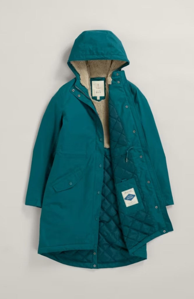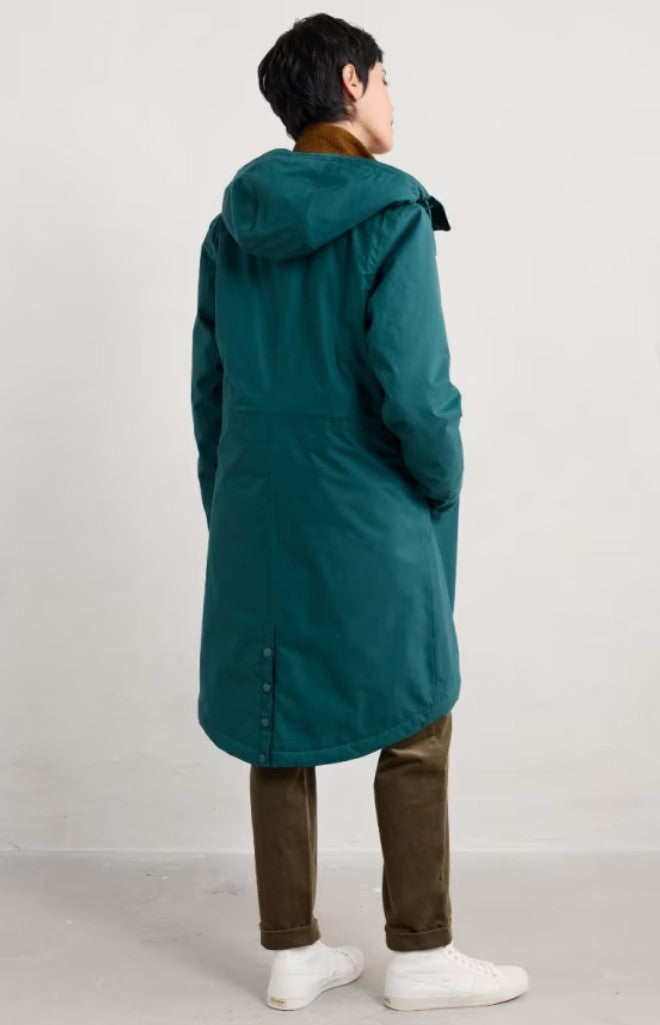 The SEASALT PLANT HUNTER 2 is a Seasalt classic raincoat shape that is fully waterproof & windproof. Falling to below the knee, it has a curved hem with a "fish tail" at the back that can be opened slightly with snaps. The coat has an attached, fleece lined hood with toggle, two slanted front pockets with flaps, inside drawstring waist to adjust for fit, front closure with inner zipper and outer placket with snaps. Inside, the coat is half lined with oatmeal coloured fleece for warmth. The lower part of the lining is quilted fabric. Made in Vietnam from 68% organic cotton tin cloth & 32% recycled nylon (outer fabric). The lining is made from 100% polyester. Machine wash at 30 degrees.