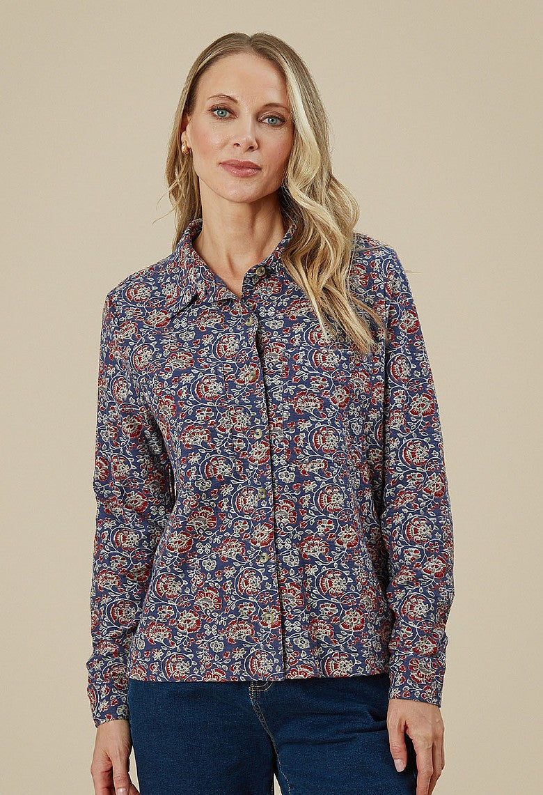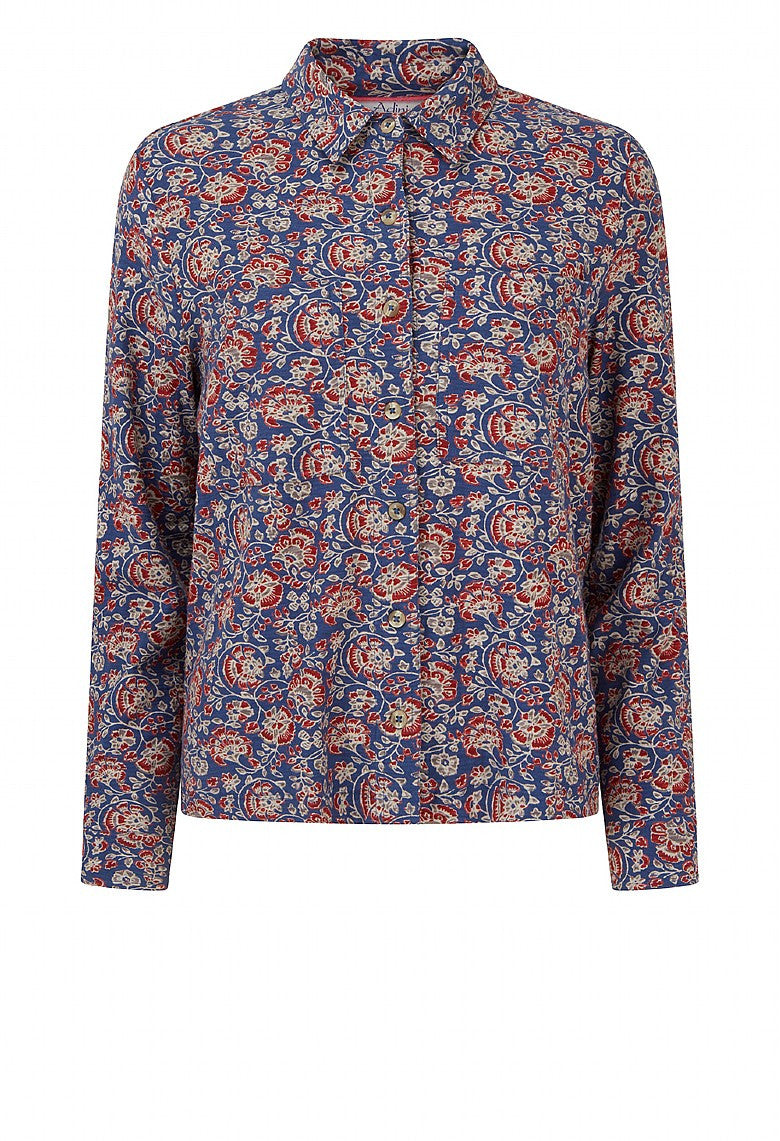 ADINI FREYA SHIRT MARINA PRINT in Blue/Opal has classic styling with a pointed collar, button opening down the front, long sleeves with buttoned cuffs & breast pockets. It has an A line shape falling to the upper thigh, so best to wear out- not tucked into trousers or skirt. It features the same print as the Antara Dress which is abstract red & grey flowers on a blue background. Made in India from 100% slub cotton jersey. Machine washable at 30 degrees.