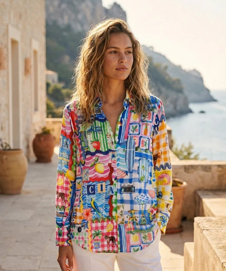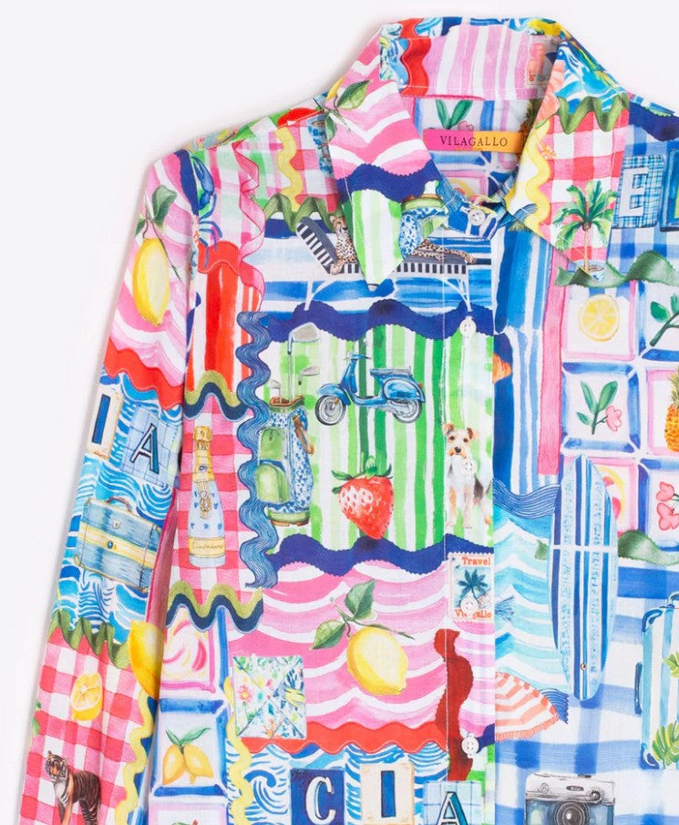 Vilagallo's Capri Ptachwork Print Shirt features whimsical summer & travel inspired multi coloured images in a patchwork layout. These summer images include dogs, tigers, parrots, cameras, motor scooters, octopuses & fruits. The shirt has a classic shape with pointed collar, front button closure, long sleeves with cuffs and a rounded hem. Made in Portugal of 100% lightweight cotton. Machine wash at 30 degrees.
