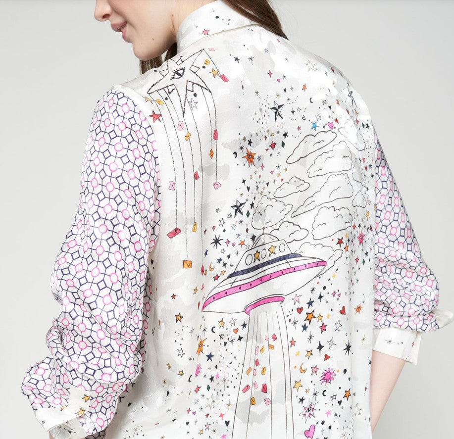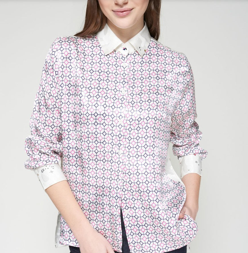 VILAGALLO'S GEOMETRICO JACQ SHIRT features pink circles & navy diamonds on a shiny, silky cream coloured background on the front & sleeves. On the back is a whimsical spaceship print. It has a man styled shirt shape including a pointed collar with stars, buttons opening down the front and a longer curved back hem. Made in Portugal of 62% rayon & 38% viscose. Machine washable.