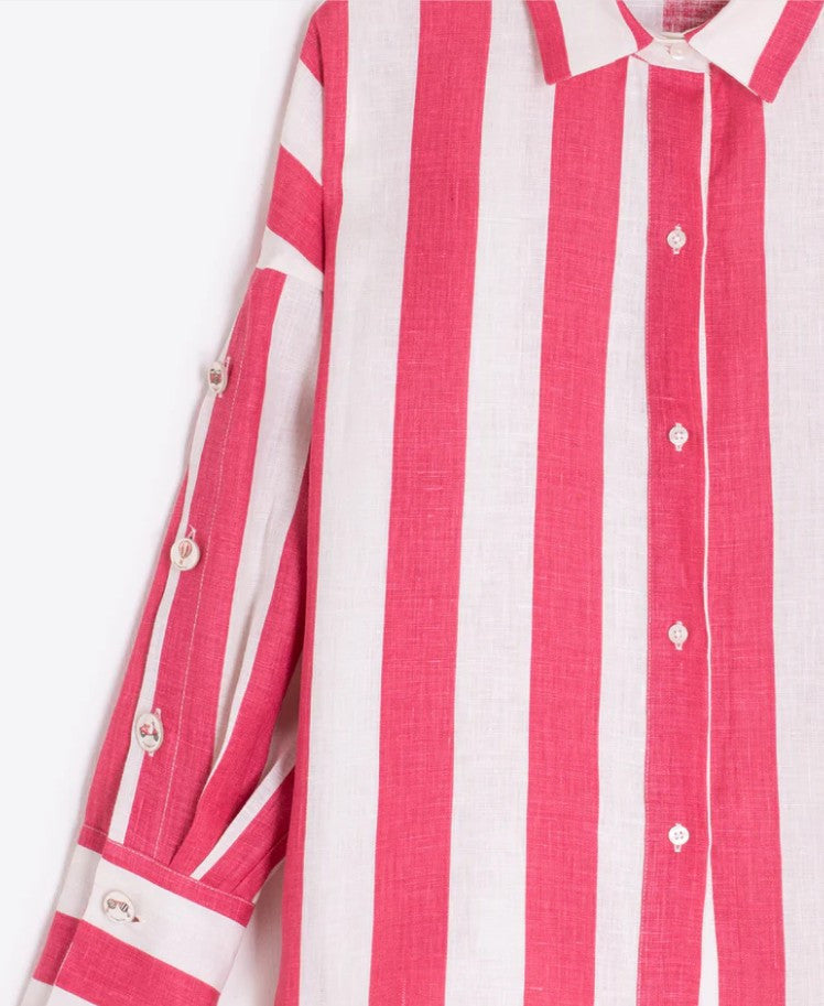 VILAGALLO'S STRIPED LINEN SHIRT has a classic shirt shape with a notched collar, front button closure and curved hem. It is unique with its wide vertical bright pink/red and white stripes and quirky decorative buttons down the side of its long sleeves with cuffs. These buttons have summer images including scooters, balloons, cameras & sunglasses. Made in Portugal of 100% midweight linen. Slightly oversized so could be worn as a light weight jacket.or overshirt. Machine washable.