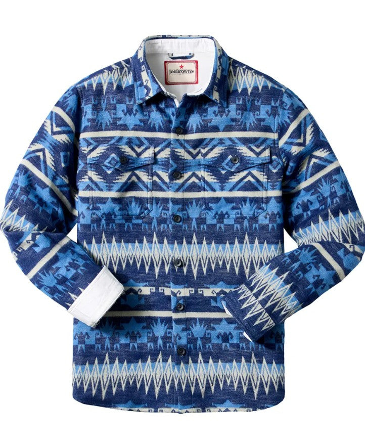 JOE BROWNS INTO THE WILD LONG SLEEVE SHIRT is a lumberjacket style with a pointed collar, buttons down the front, 2 chest pockets with buttoned down flaps, & long sleeves with cuffs. Featuring a bold blue & beige Aztec print, it is made in India from 100% brushed cotton. Machine wash at 30 degrees.