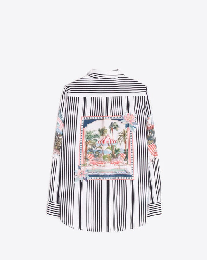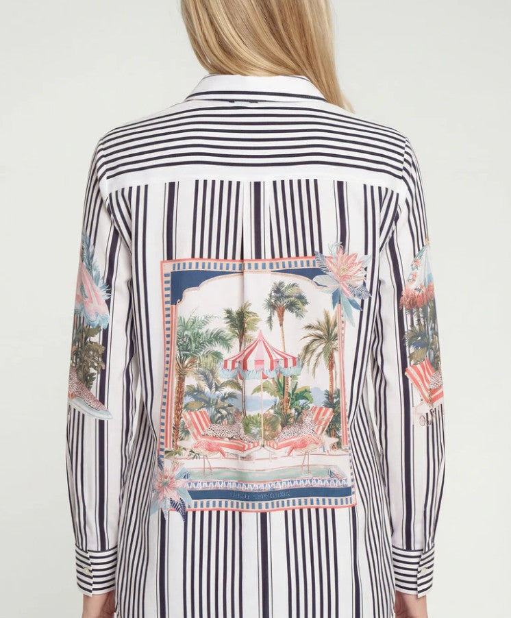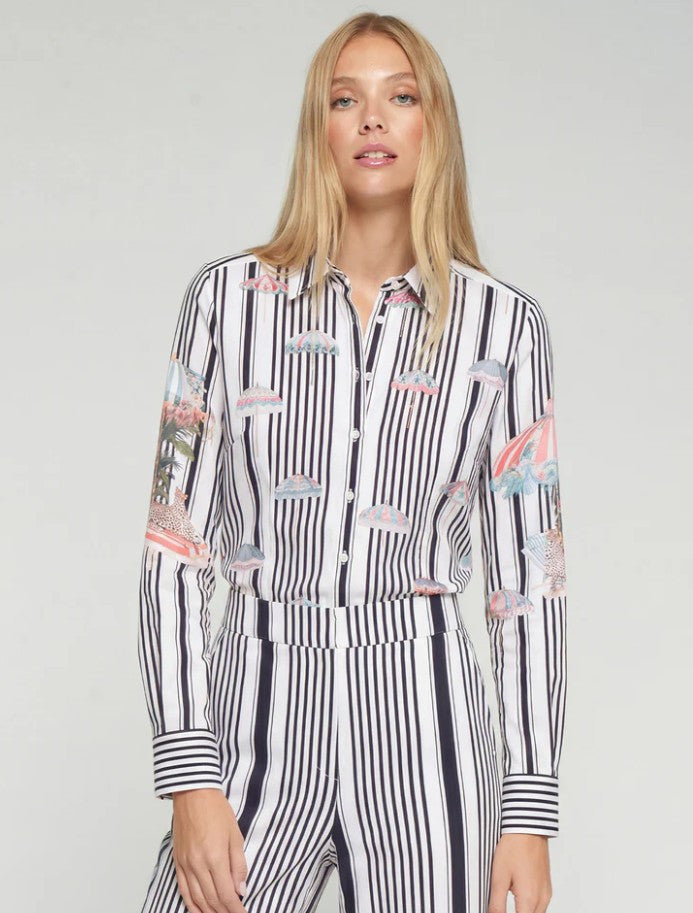 Vilagallo's Black & White vertically striped shirt with Umbrellas is a fun shirt to wear in all seasons. The black & white vertical stripes on the front & sleeves are punctuated with umbrellas in pink, grey & cream. The unusual feature is on the back of the shirt, with a large framed print of a pool scene with a carousel style umbrella and palm trees, surrounded by black & white vertical stripes as on the front. The shirt has a classical style with a pointed collar, front button closure & long sleeves with cuffs. Made in Portugal from 100% tencel. Machine wash at 30 degrees.
